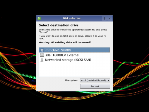 Note – Be very careful as to which disk you select for use , as in, make sure its not already being utilised for anything else as this process will clear the disk and delete anything currently saved there.
