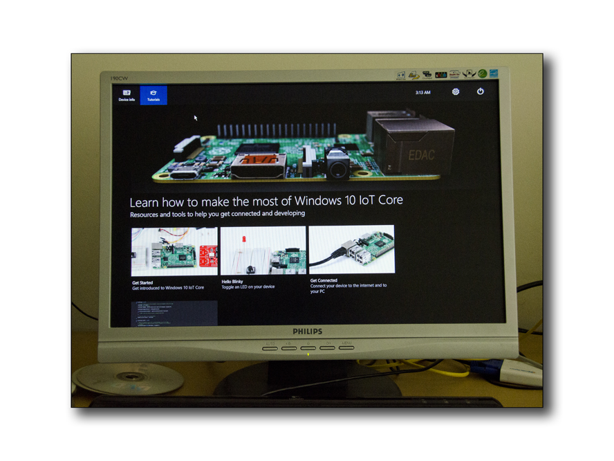 When you have completed the installation of Windows 10 IOT core, following the setting up and getting going instructions from the link here, you are presented with a very basic screen on first boot, this shows such details as your IP address and basic system details such as installed devices.